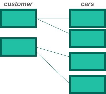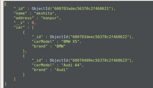 In this example a customer can have many cars in it. But a car can have only customer. So details of cars save in the customer collection