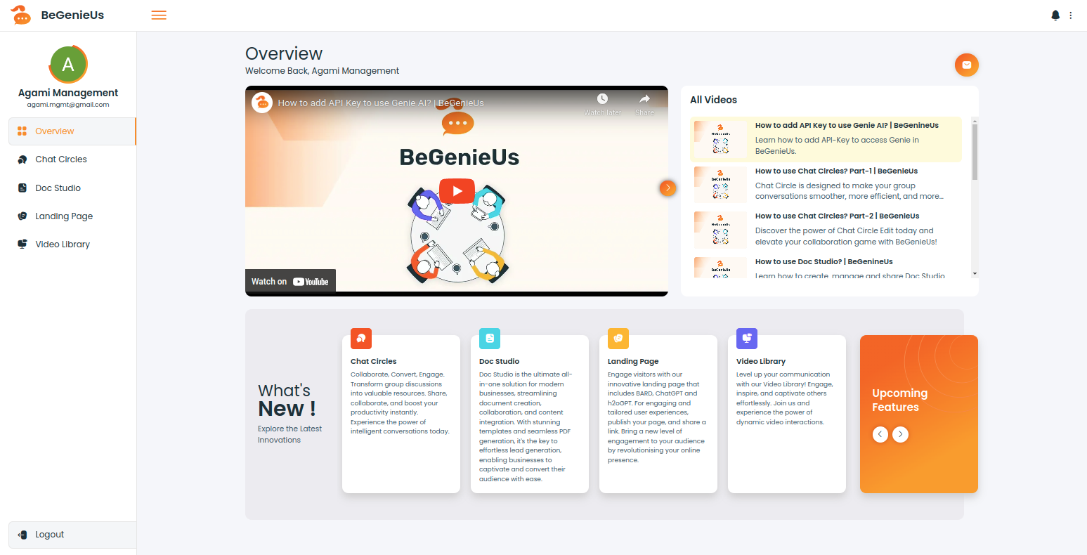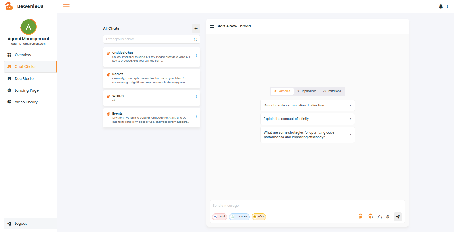 BeGenieUs is not a mere tool; it is a comprehensive platform that encompasses a spectrum of functionalities. From fostering intelligent conversations through Chat Circles to revolutionizing document creation in Doc Studio, and from crafting engaging landing pages using BARD, ChatGPT, and H2O GPT to enhancing communication through the Video Library, BeGenieUs is a versatile AI Swiss army knife designed to cater to diverse digital needs.