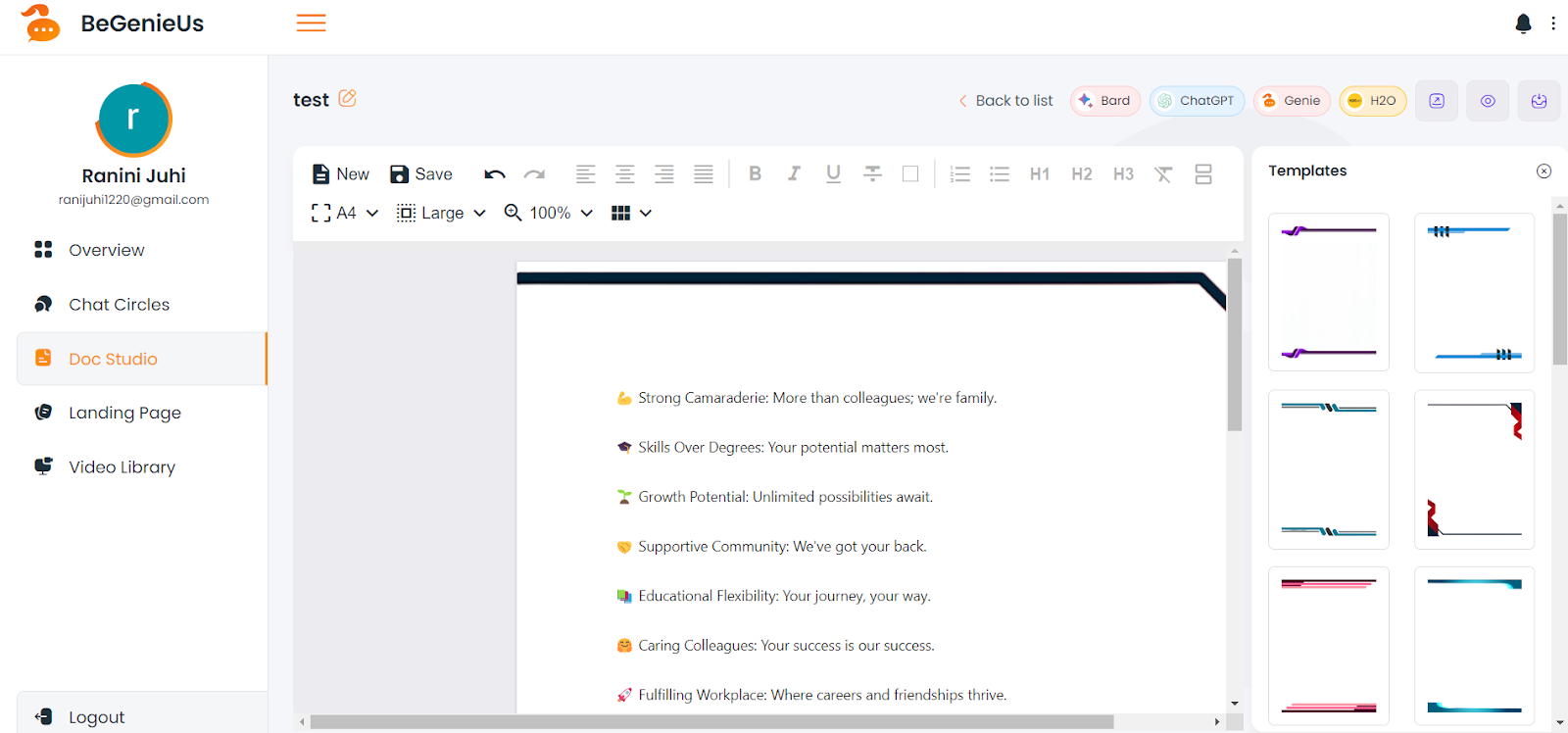 Users can seamlessly access AI tools, including BardAI, ChatGPT, H2OGPT, and Genie, to enhance their document creation and information retrieval processes.