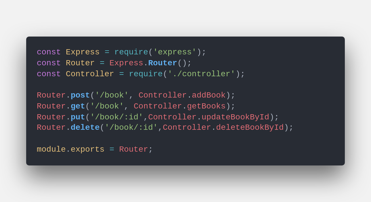 In route.js we loaded the controller to perform operations. All four operations will be performed in the controller. route.js will just redirect the incoming request to the function based on the request.