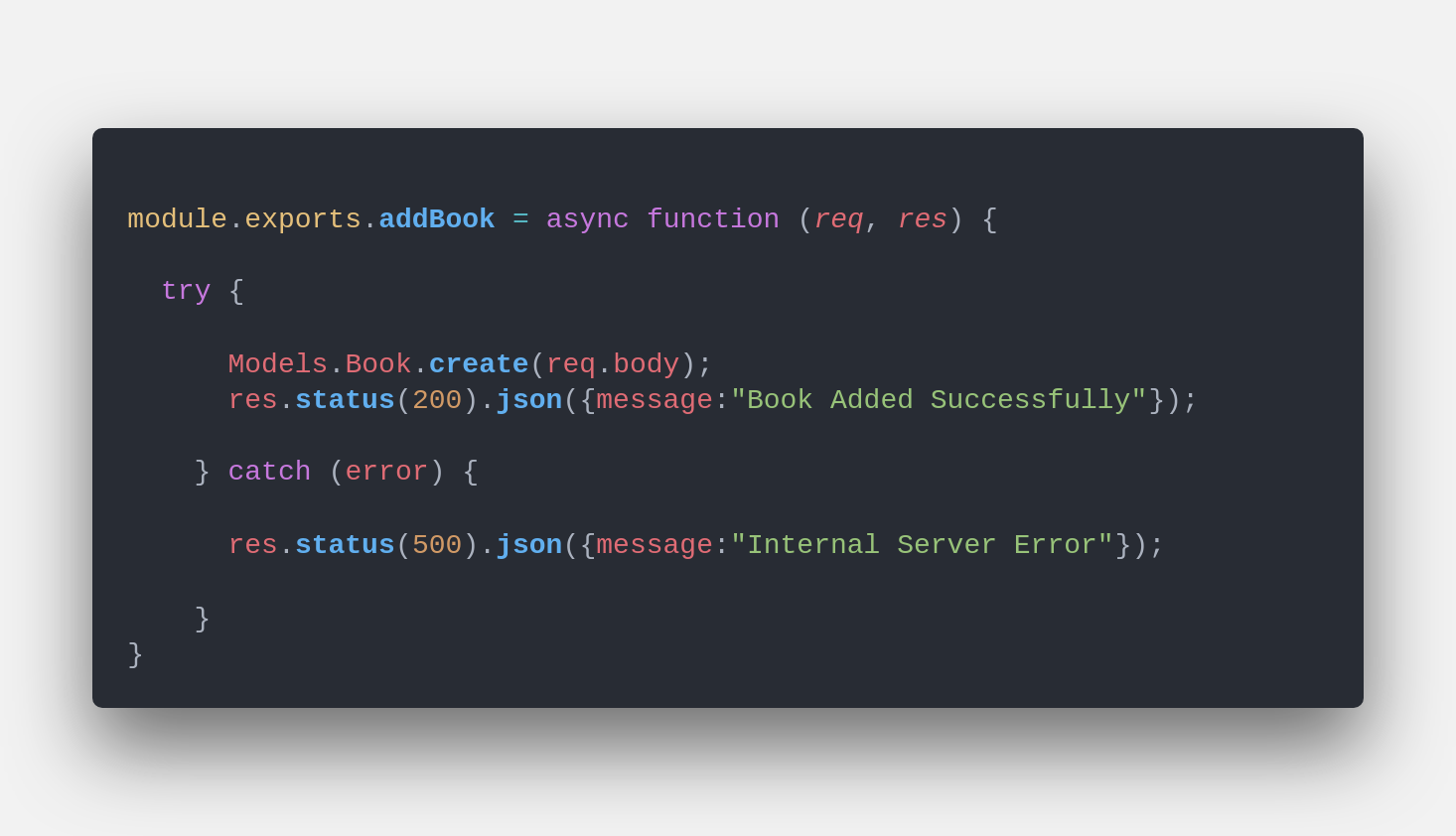 The content-type is application JSON and the information is passed in the body. Once the request is received by the controller, the create function will insert the book information in the database and send back the response 200 to the client.
