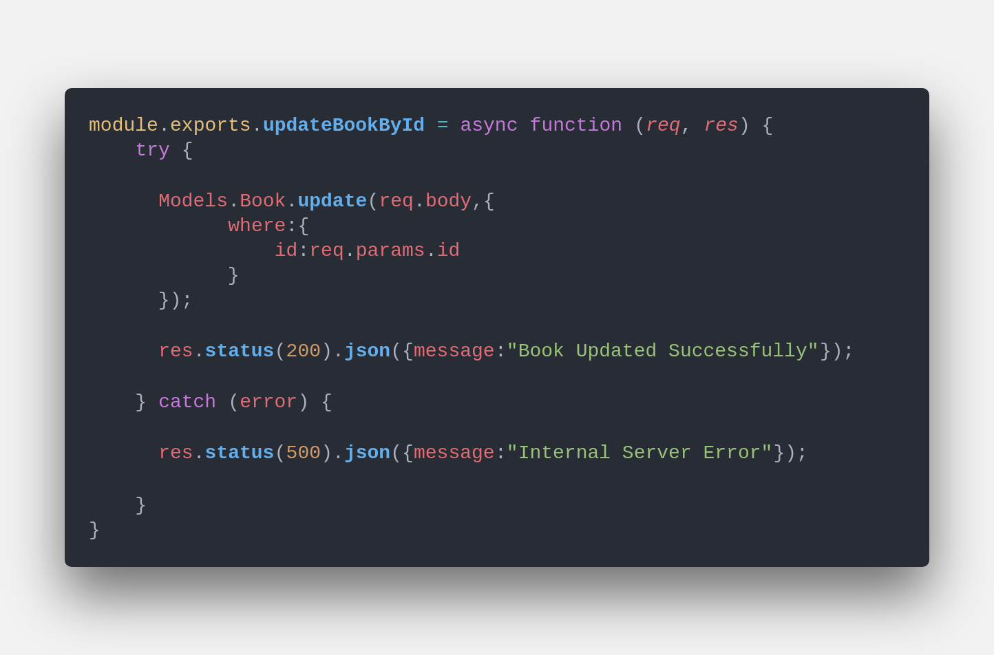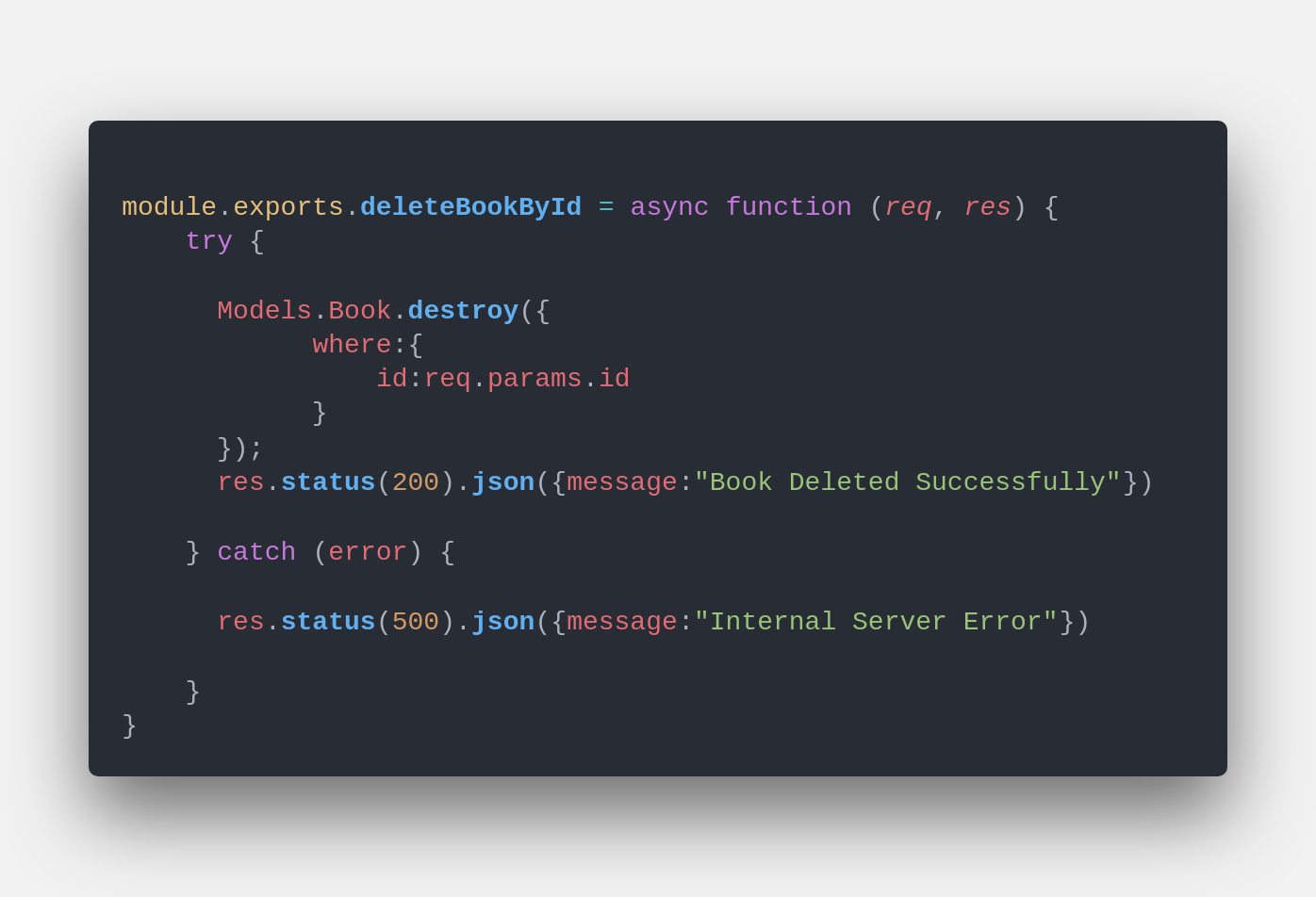 delete function will delete the books from the database against the Id and send back the response 200 to the client.
