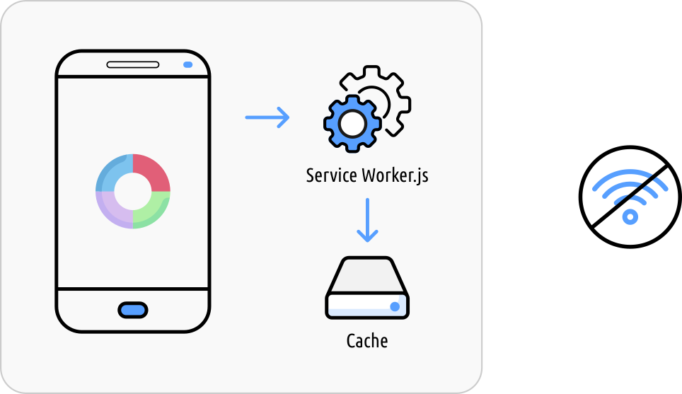 The whole website can be available offline like native apps (Facebook, WhatsApp, etc. ). Facebook, WhatsApp, etc works offline even if you are connected or not connected to the network, in the same way, your PWA is available offline.